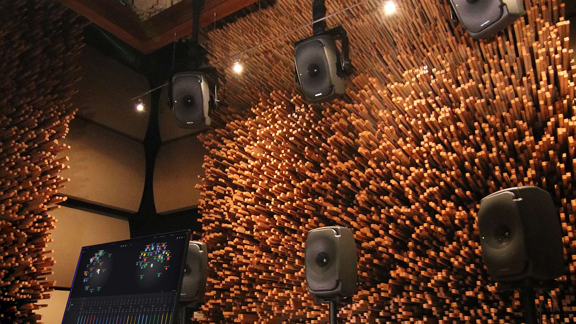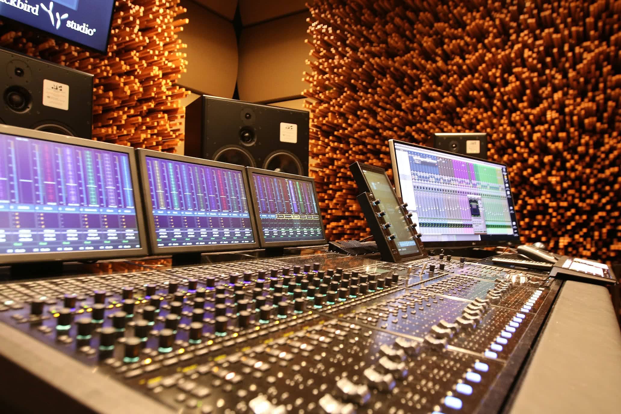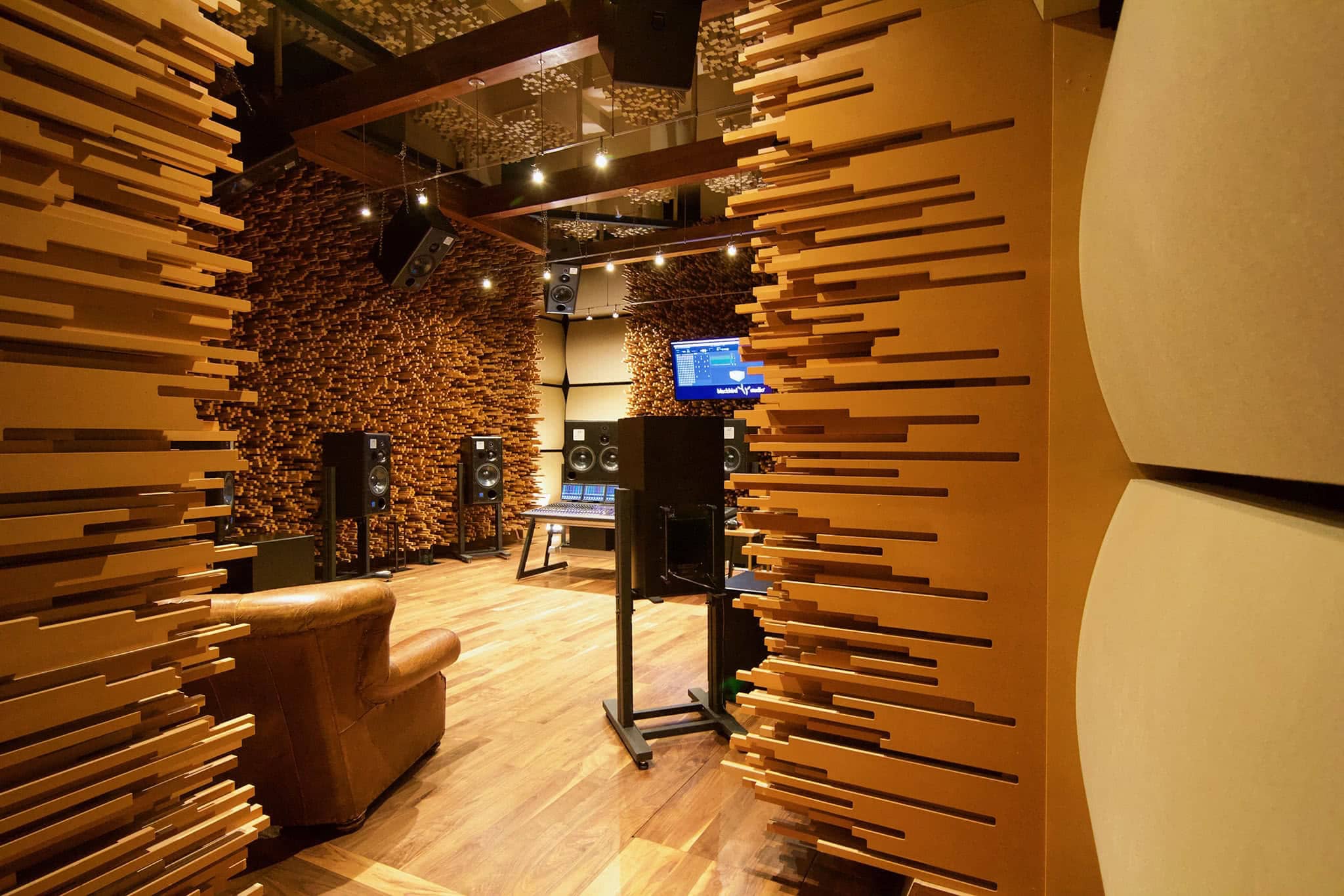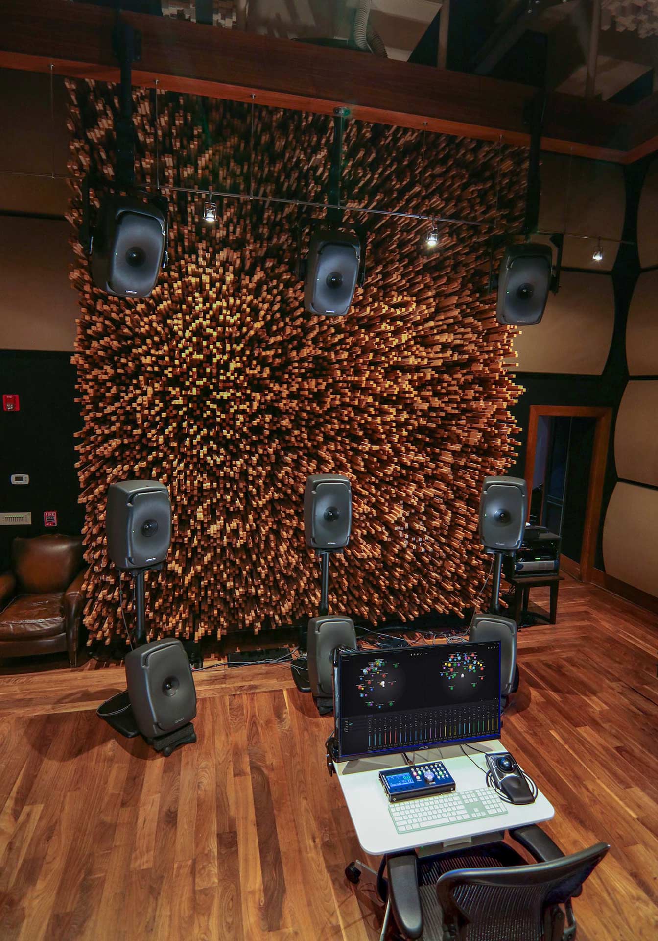 Blackbird Studio C is simply the finest immersive mix and playback environment in the world. The room’s open floor plan was designed by multiple Grammy and TEC Award-winner, producer, engineer, and inventor George Massenburg and Dr. Peter D’Antonio, founder of RPG Diffusor Systems, Inc. The design focuses on sound diffusion and is created from a 10,000-page Excel spreadsheet based on acoustic diffusion algorithms. The result is a mix of art and function: 138,646 individual sticks of formaldehyde-free MDF wood in four-foot-by-eight-foot sheets, with no two being the same size or length. The studio contains slightly more than 100,000 lbs. of wood on the walls.